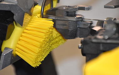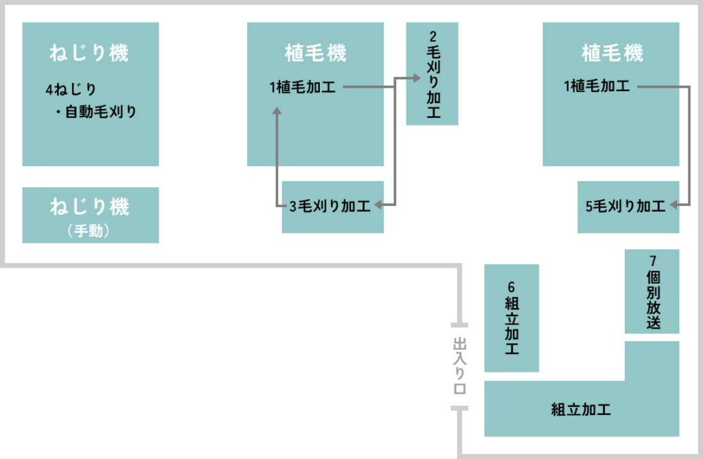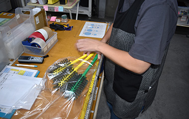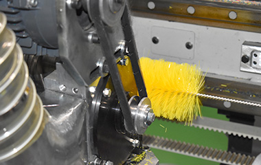 主にHACCP向け製品のタワシやパイプブラシの「ねじり加工」「自動毛刈り」をオートメーションで行います。