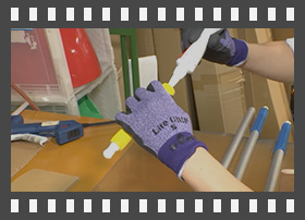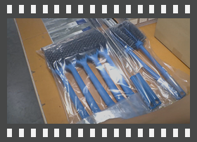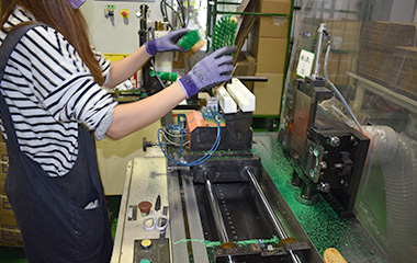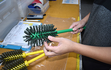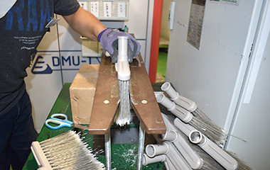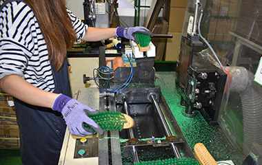 主に商品のブラシ部分と柄の部分を結合する工程です。