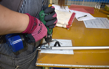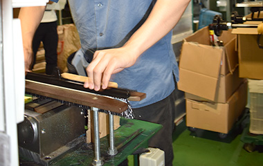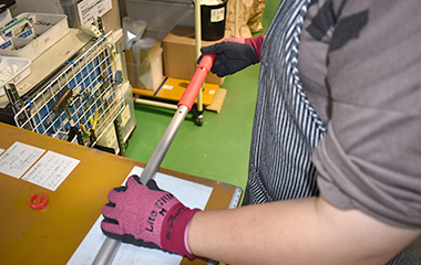 ベテランの作業スタッフが一つ一つ手作業で行っており、他にも袋入れを行ったり特注品のためのサイズ変更加工なども行っています。